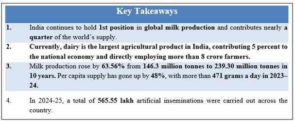 - Dairy contributes 5% to India’s GDP and supports 8 crore farmers, mostly smallholders.